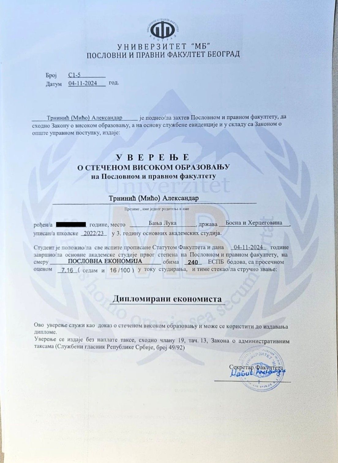 „Aleksandar Trninić je 4.11.2024. godine završio osnovne akademske studije na Poslovnom i pravnom fakultetu, na smjeru Poslovna ekonomija, sa 240 ESPB bodova i prosječnom ocjenom 7,16 stekao zvanje diplomirani ekonomista“, navodi se u uvjerenju.