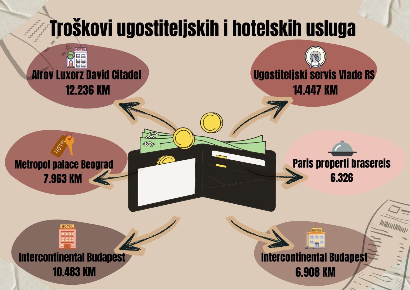 U hotelu „Intercontinental Budapest“ 05. decembra prošle godine potrošeno je 10.483 marke, a u februaru gotovo sedam hiljada maraka.
