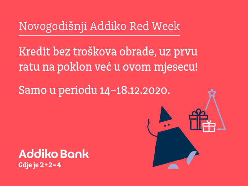 „I tokom cijele 2020. godine našim smo klijentima omogućavali niz pogodnosti za kupovinu i korištenje Addiko proizvoda i usluga. U skladu sa istom strategijom, a u okviru Novogodišnjeg Addiko Red Week-a, pored prve rate na poklon koja će, klijentima koji realizuju kredit u okviru ove posebne ponude, biti isplaćena već u ovom mjesecu, omogućiti i odobrenje kredita bez troškova obrade.“ istakao je Boštjan Pečenko, član Uprave Addiko Bank a.d. Banja Luka.