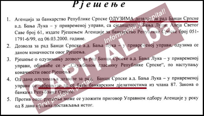 „Od dana oduzimanja dozvole za rad, Banci Srpske u privremenoj upravi zabranjuje se da se bavi bankarskim djelatnosima iz člana 87. Zakona o bankama RS“, navedeno je u Rješenju Agencije.