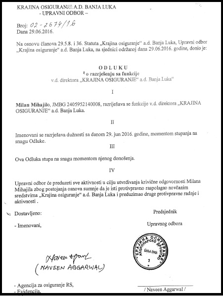 U poništenoj odluci kao razlog smjene Mihajila bilo je da je “izvršio transfer–nalog za isplatu novca sa računa za redovno poslovanje „Krajina osiguranja“ bez prethodne saglasnosti UO i to u ukupnom iznosu od 147.874 KM“.