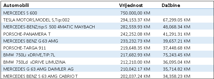 Pored ovih, među najskupljim automobilima uvezenim u BiH u ovoj godini nalaze se i mercedes S500 4MATIC Maybach, koji je koštao 282.559 KM, a na njega su plaćene i dažbine u iznosu od 48.068 KM.