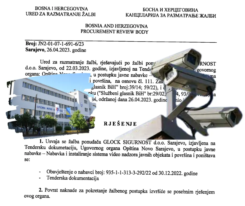 SARAJEVO – Based on the appeal filed by the company Glock Sigurnost d.o.o Sarajevo, the Appeals Office has annulled the tender documentation and procurement notice of the Municipality of Novo Sarajevo for the Procurement and Installation of a Video Surveillance System for public facilities and areas (935-1-l-313-3-292t22) dated December 30, 2022.