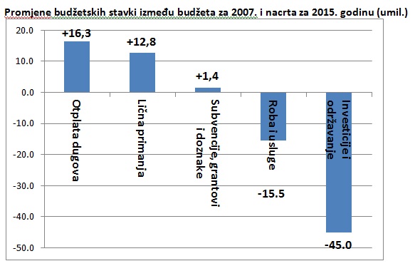 U budžetu za 2015. godinu rashodi za lična primanja su dostigli cijelih 36,8 miliona KM, što je porast za čak 12,8 miliona KM u odnosu na 2007. godinu.