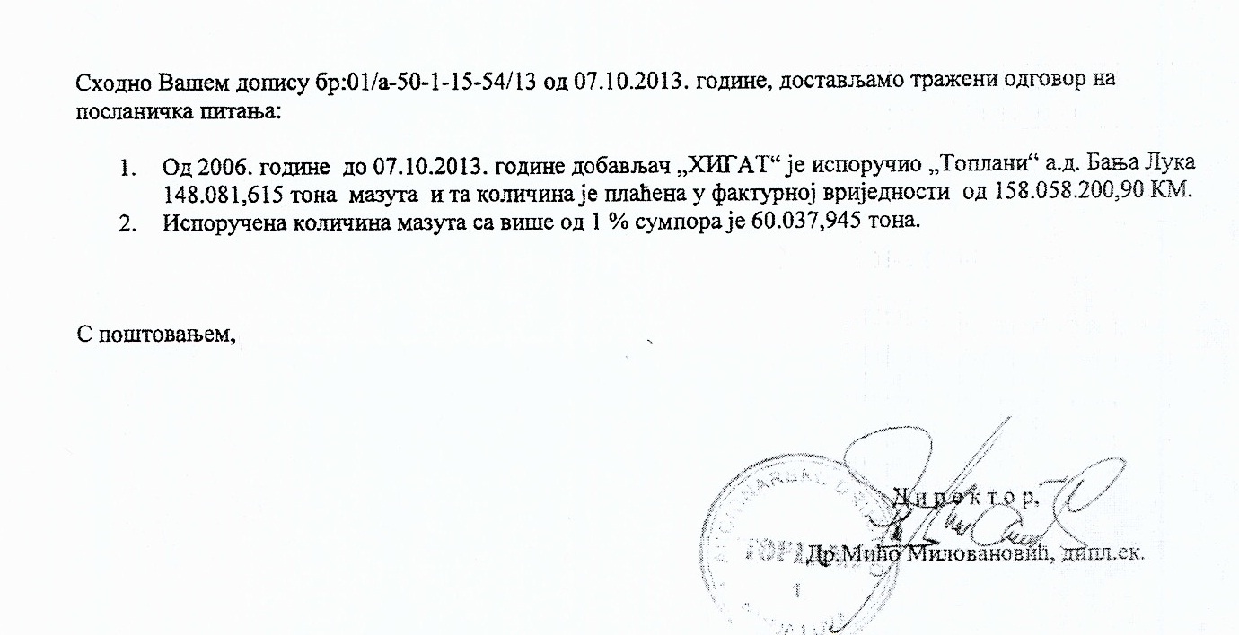 Ministar trgovine i turizma RS Gorana Zlatković, ministar industrije, energetike i rudarstva Željko Kovačević, te ministar za prostorno uređenje, građevinarstvo i ekologiju Srebrenka Golić šalju Šaroviću identično pismo u kojem od njega traže da, prekrši Odluku o kvalitetu tečnih naftnih derivata i odobri zahtjev banjalučkoj Toplani za uvoz visokosumpornog mazuta iako kvalitetniji mazut postoji na domaćem tržištu.