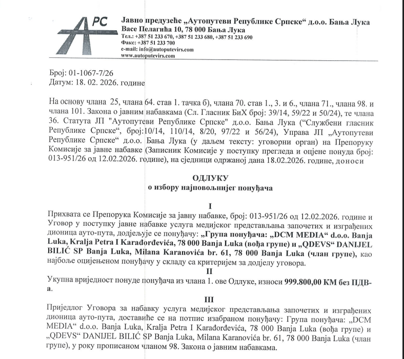 BANJALUKA – „Autoputevi Republike Srpske“, na čijem je čelu Radovan Višković, dali su ugovor za medijsko predstavljanje izgrađenih i započetih dionica vrijedan 1,1 milion maraka grupi ponuđača sastavljenoj od  firmi „DCM media“ i „QDEVS“ iz Banjaluke, saznaje CAPITAL.