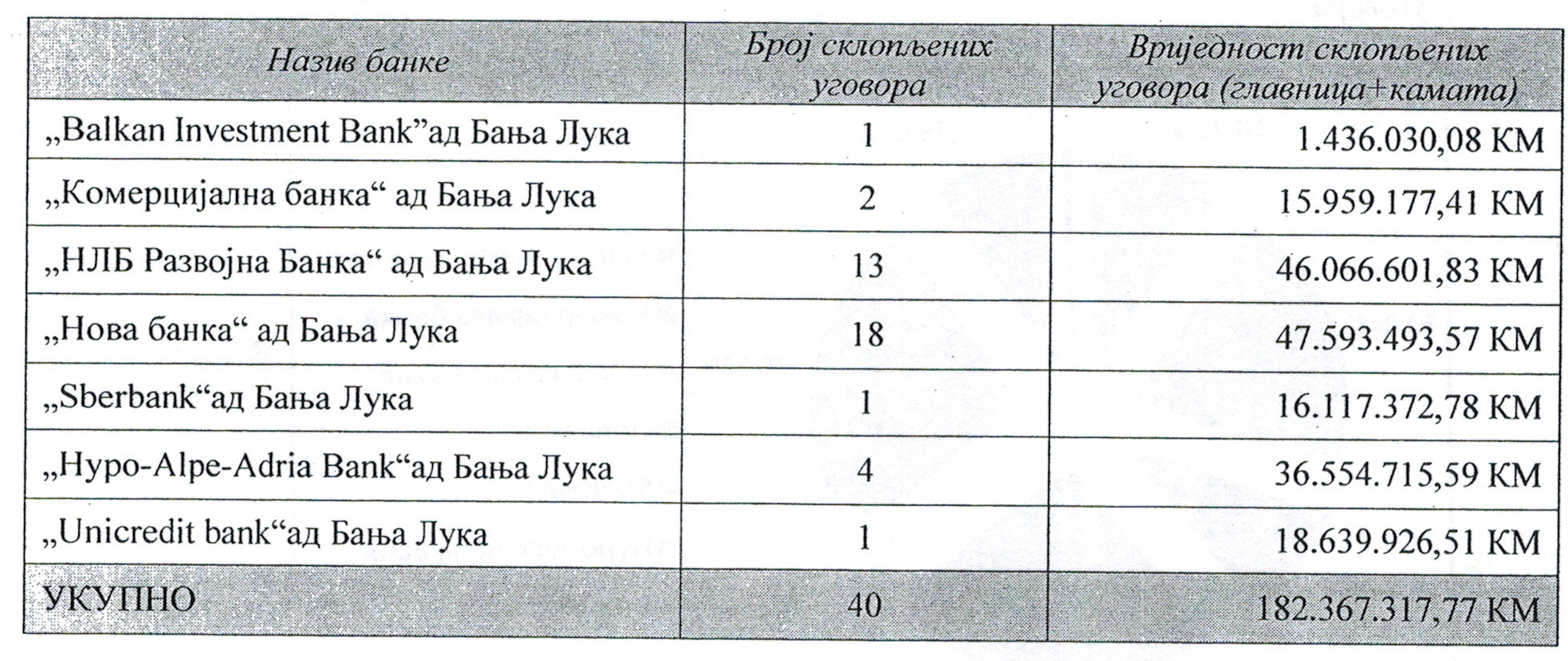 Sa „Hypo –Alpe-Adria Bankom“ potpisana su četiri kredita vrijednosti 26 miliona KM, a preostali iznos zaduženja rukovodstvo uprave Grada Banjaluka je potpisalo sa „Unicredit bankom“ (18,6 mil.) „Sberbankom“ (16 mil.), „Komercijalnom bankom“ (15,9 mil.) , te „Balkan Investment Bankom“ (1,4 mil.), navodi se Informaciji Odjeljenja za finansije uprave grada Banjaluka.