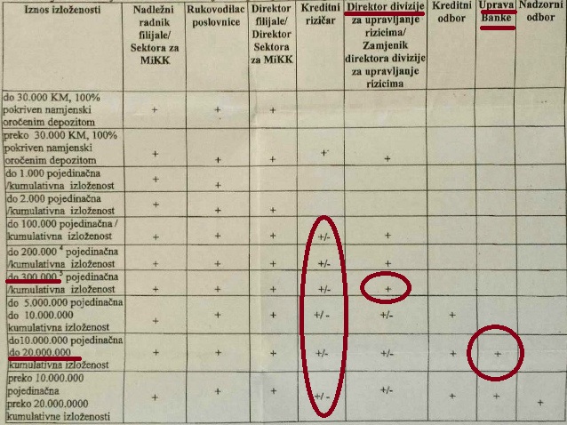 Ni u jednoj drugoj banci u Republici Srpskoj službenici nemaju ovako velika ovlaštenja: direktor Divizije za upravljanje rizicima ili njegova zamjenik mogu odobriti kredit do čak 300.000 KM. Štaviše, takav kredit uopšte ne ide na razmatranje Kreditnog odbora niti Uprave. Kreditni odbor, samostalno, odobrava kredit od pet miliona (pojedinačno) do 10 miliona KM kumulativne izloženosti, navodi se u “Pravilniku o ovlašćenjima i odgovornostima”.