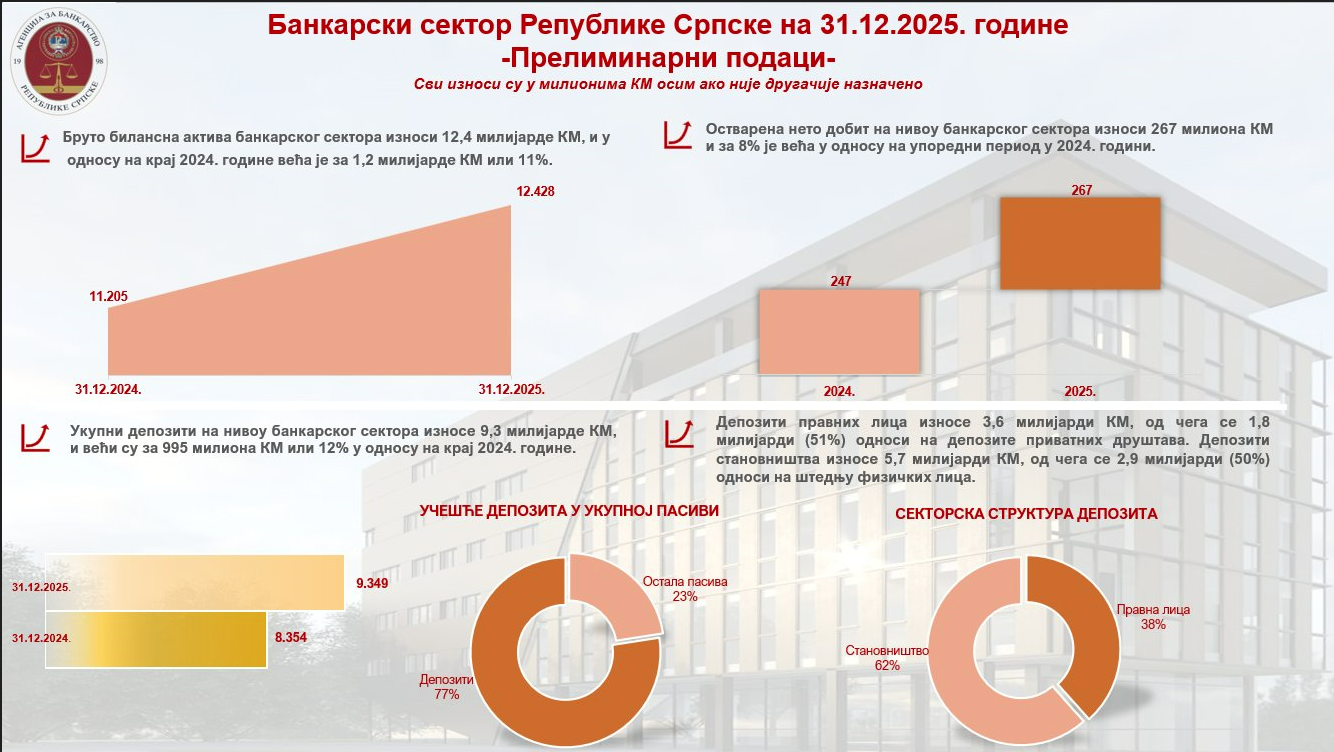 Bruto bilansna aktiva veća je u odnosu na 2024. godinu za 1,2 milijarde maraka i iznosi 12,4 milijardi KM.