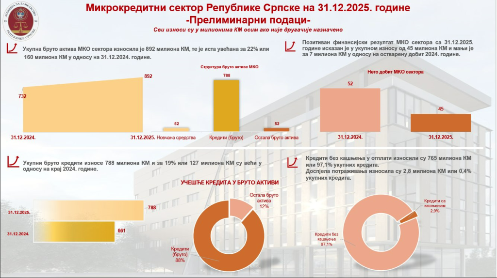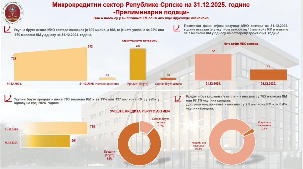 Kada govorimo o mikrokreditnim društvima, ukupna bruto aktiva ovog sektora iznosila je 892 miliona KM, te je ista uvećana za čak 22 odsto ili 160 miliona KM u odnosu na 2024. godinu.