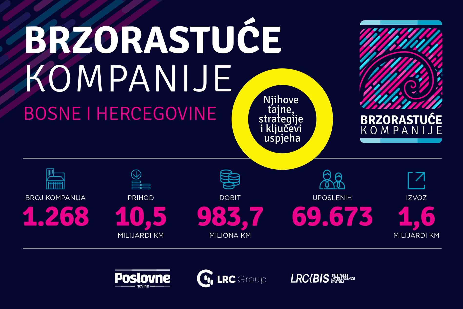 Podatke o brzorastućim kompanijama pripremili su analitičari LRC-a i to prema posljednjim dostupnim završnim računima. Prema tim podacima, u 2019. godini u Federaciji BiH i Republici Srpskoj poslovalo 1.268 brzorastućih kompanija u koje su zapošljavale 69.673 radnika. Brzorastuće bh. kompanije su prošle godine ostvarile prihod od 10,5 milijardi KM, dobit od 983,7 miliona KM i izvoz u iznosu od 1,5 milijardi KM. Kriteriji su isti kao i prethodnih godina, a to znači da su se gledali rast prihoda i broja zaposlenih u prethodne tri godine, pozitivna dobit u prošloj i tekućoj godini, kao i da je u analiziranoj godini prihod bio veći od 300.000 KM. Za dobijanje statusa brzorastuće kompanije se tražila i bonitetna ocjena koja je najmanje 3, a najviše pet, kao i rast po CAGR-u (složena godišnja stopa rasta) od 10% i više.