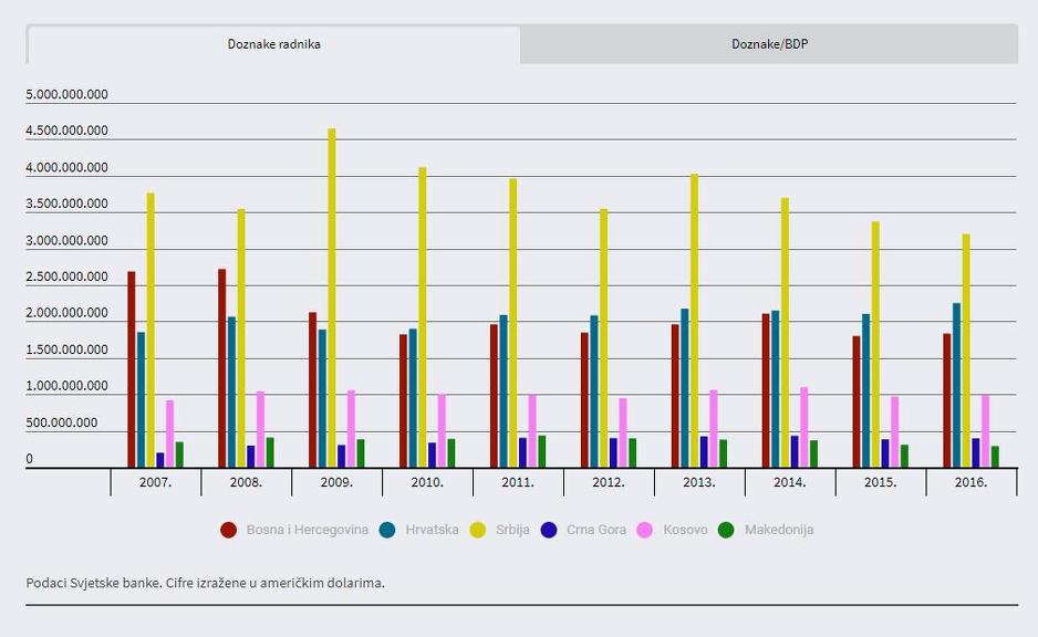 Gastarbajteri su 2016. godine, prema podacima Svjetske banke, u Srbiju poslali 3198 milijardi dolara. Doznake hrvatskih radnika iznosile su 2252 milijarde, dok je u Bosnu i Hercegovinu iz inostranstva pristigla 1831 milijarda dolara, piše Al Jazeera Balkans.