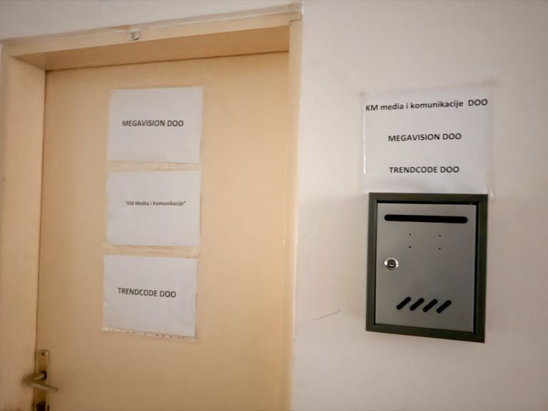 Novinari redakcije Gerila obišli su pomenutu adresu u julu ove godine i na prvom spratu, poslije nekoliko advokatskih kancelarija, pronašli jedna vrata na kojima su na običnom papiru odštampana imena čak tri firme, odnosno pomenuti “Megavision” i “KM Media i Komunikacije”, ali i “Trendcode”.