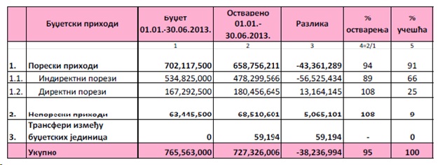 Sa druge strane, na računima budžeta na dan 30.06.2013. godine bilo je 105,472,081 KM. Međutim, kada se od ukupnog iznosa zatečenih novčanih sredstava oduzme dio sredstava koja ne mogu biti korištena za servisiranje redovne potrošnje, dobiju se raspoloživa novčana sredstva za izmirenje tekućih obaveza u iznosu od 78,874,850 KM. Ali s obzirom da su neizmirene obaveze bile 101,6 miliona, to znači da je budžet prvih šest mjeseci završio sa minusom od 22,7 miliona KM.