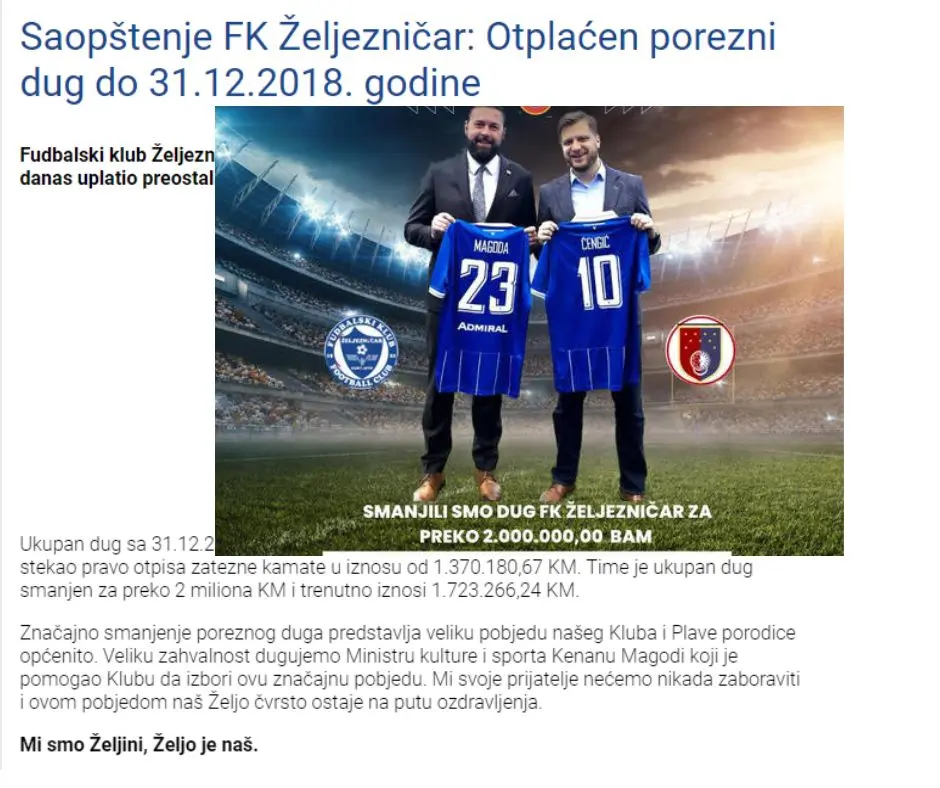 Podsjećanja radi, iz FK Sarajevo su u decembru 2022. obavijestili javnost da su ispunjene sve obaveze i uslovi koje su investitori, Ismir Mirvić i Vincent Tan, preuzeli po ugovoru potpisanom 20.09.2021. kada su i zvanično postali vlasnici 98,26 odsto glasačkih prava.