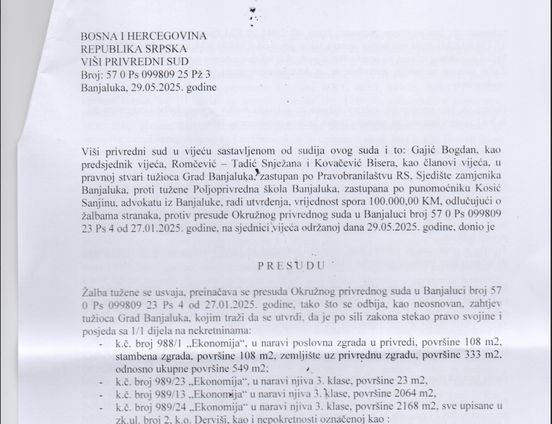 Sud podsjeća da je ovaj maratonski postupak pokrenut tužbom Grada Banjaluka podnesenom još 2012. godine, kojom se tražilo da se utvrdi da je ništavan upis prava vlasništva spornih nekretnina na Poljoprivrednu školu kao tuženu, te da je od tada donesen niz različitih sudskih presuda.