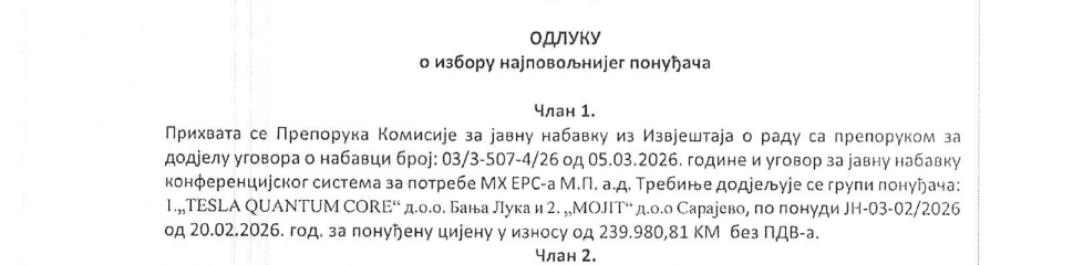 BANJALUKA – Firma „Tesla quantum core“ iz Banjaluke u posljednje vrijeme dobija unosne ugovore od javnih preduzeća i institucija, a posljednji u nizu je onaj koji im je dala „Elektroprivreda Republike Srpske“ (ERS) za nabavku konferencijskog sistema.