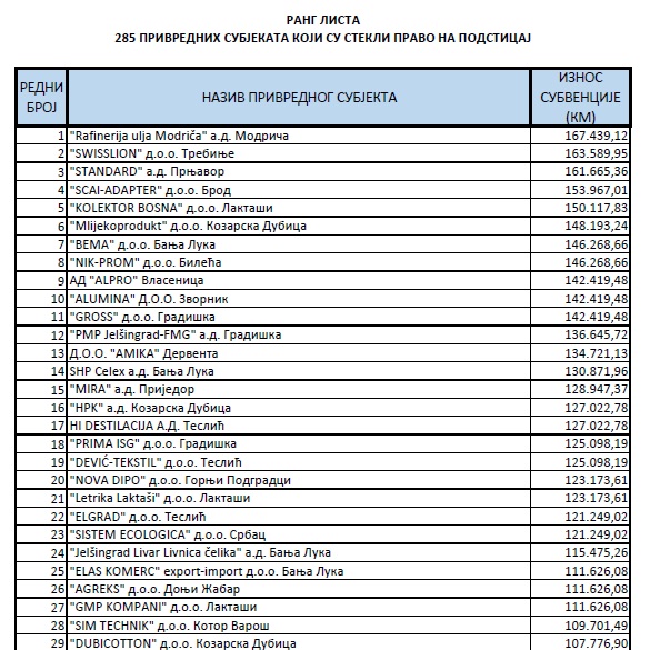 Na dnu tabele su firme koje su dobili po 21 hiljadu KM, poput „Beoplast“ Trn, Laktaši i „Klama-prom“ Gradiška.