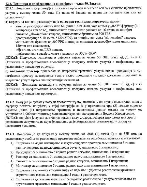 Među tim uslovima, između ostalog, su pozitivno poslovanje u prošloj godini, ali i do detalja opisana oprema za video produkciju, studio adekvatne površine, te osoblje za realizaciju ove nabavke sa određenim znanjima i iskustvima.