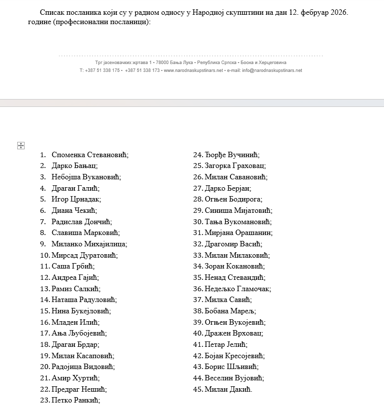 Na spisku poslanika koji su se za riječ javili jednom ili dva puta nalazi se i aktuelna potpredsjednica NS RS Nina Bukejlović, koja je u Skupštinu ušla 2022. godine kao poslanik SNSD-a, regularnim mandatom.