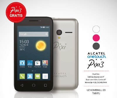 Ono što izdvajaju kao posebnu aktuelnost najnovije m:tel-ove ponude jeste to što uz Kombinuj 20 tarifu, potpuno besplatno, dobijate telefon Alcatel Pixi 3! Riječ je veoma praktičnom dual sim modelu koji omogućava istovremeno korišćenje dvije sim kartice, posjeduje displej veličine 4 inča, te Dual-core 1 GHz Cortex-A7 procesor i 4 GB memorije, odnosno 512 MB RAM-a.