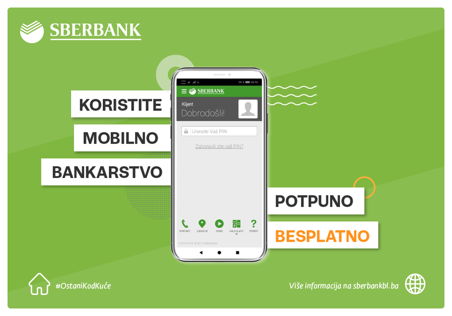 „U skladu sa novonastalom situacijom, kao i mjerama prevencije koje se sprovode zbog širenja koronavirusa, odlučili smo da svojim klijentimaomogućimo korištenje mobilnog bankarstva, bez mjesečne naknade.Svoje transakcije klijenti mogu da obavljaju bez odlaska u poslovnicu Banke, iz sigurnosti svog doma, koristeći aplikaciju mSberbankBL. Uz naše mobilno bankarstvo klijenti imaju jednostavan i bezbjedan pristup svim svojim računima, potpunu kontrolu vlastitih finansija, te mogu da obavljaju plaćanja 24/7. Na ovaj način, preduzimamo sve kako bi klijentima olakšali svakodnevno poslovanje sa Bankom, te kako bi izbjegli nepotrebne kontakte u poslovnicama.Zdravlje i sigurnost naših klijenata nam je na prvom mjestu“, poručili su iz Sberbank a.d. Banja Luka, i ovim putem pozvali klijente da ostanu u svojim domovima, te da na taj način budu odgovorni prema sebi, ali i prema drugima.