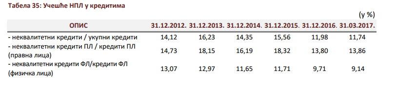 Loši plasmani su neznatno smanjeni u odnosu na kraj 2016. i to, prije svega, zahvaljujući fizičkim licima. U nekvalitetnim kreditima preovladavaju loši krediti pravnih lica koji iznose 352,3 miliona KM i imaju stopu rasta od jedan odsto, dok nekvalitetni plasmani fizičkih lica bilježe pad učešća i iznose 189,8 miliona KM.