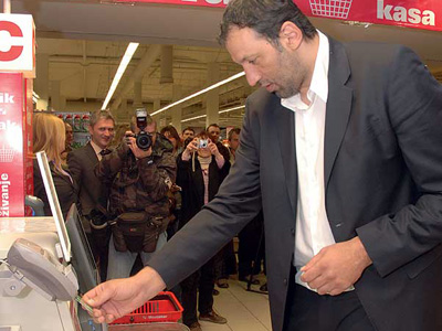 BEOGRAD, U hipermarketu tržnog centra Merkator-S u Beogradu danas je pušteno u rad osam samouslužnih tik-tak kasa koje će kupcima omogućiti jednostavniju i bržu kupovinu, a prvi kupac je bio predsjednik Olimpijskog komiteta Srbije i proslavljeni košarkaški as Vlade Divac.