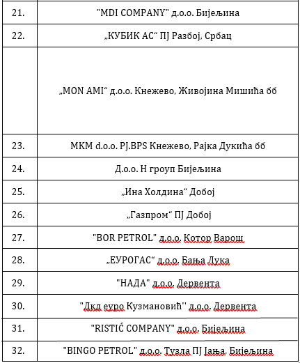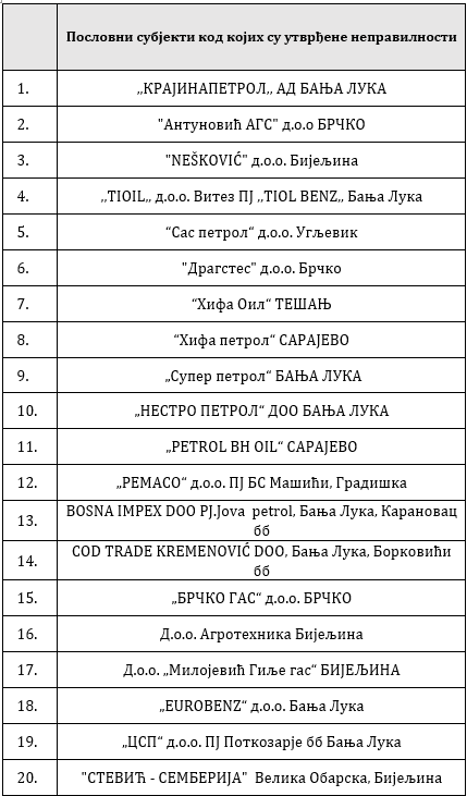 Spisak poslovnih subjekata kod kojih su utvrđene nepravilnosti:
