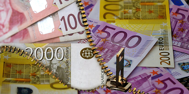 Dinar će u ponedjeljak vrijedeti prema evru 0,2 odsto manje nego prije mjesec dana, na godišnjem nivou će biti jači za 0,8 procenata, a u odnosu na početak godine jači za 0,1 posto.