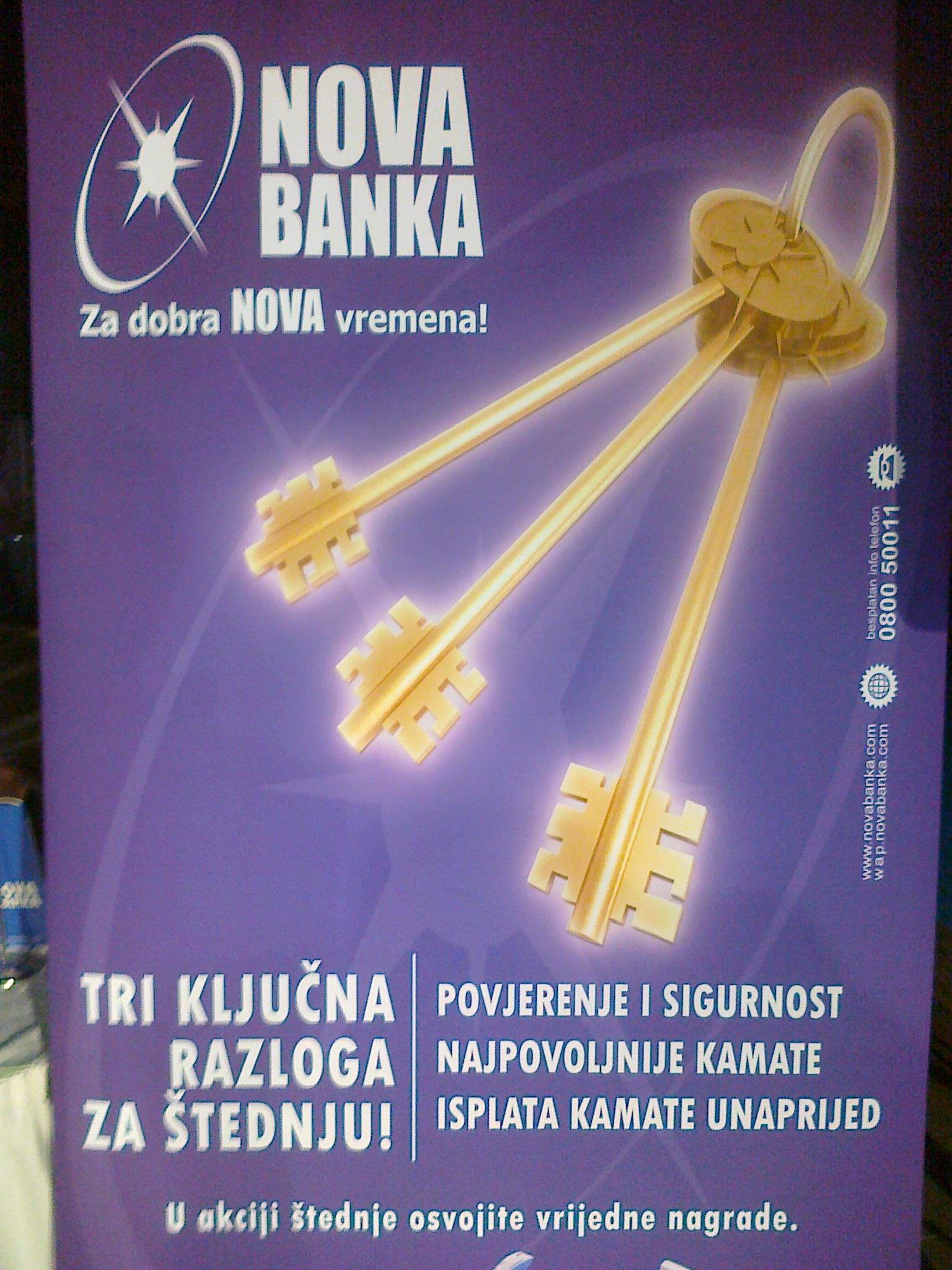 U kampanji „Tri ključna razloga za štednju“ Nova Banka svojim štedišama garantuje tri stvari: povjerenje i sigurnost, najpovoljnije kamate, te isplatu kamate unaprijed.