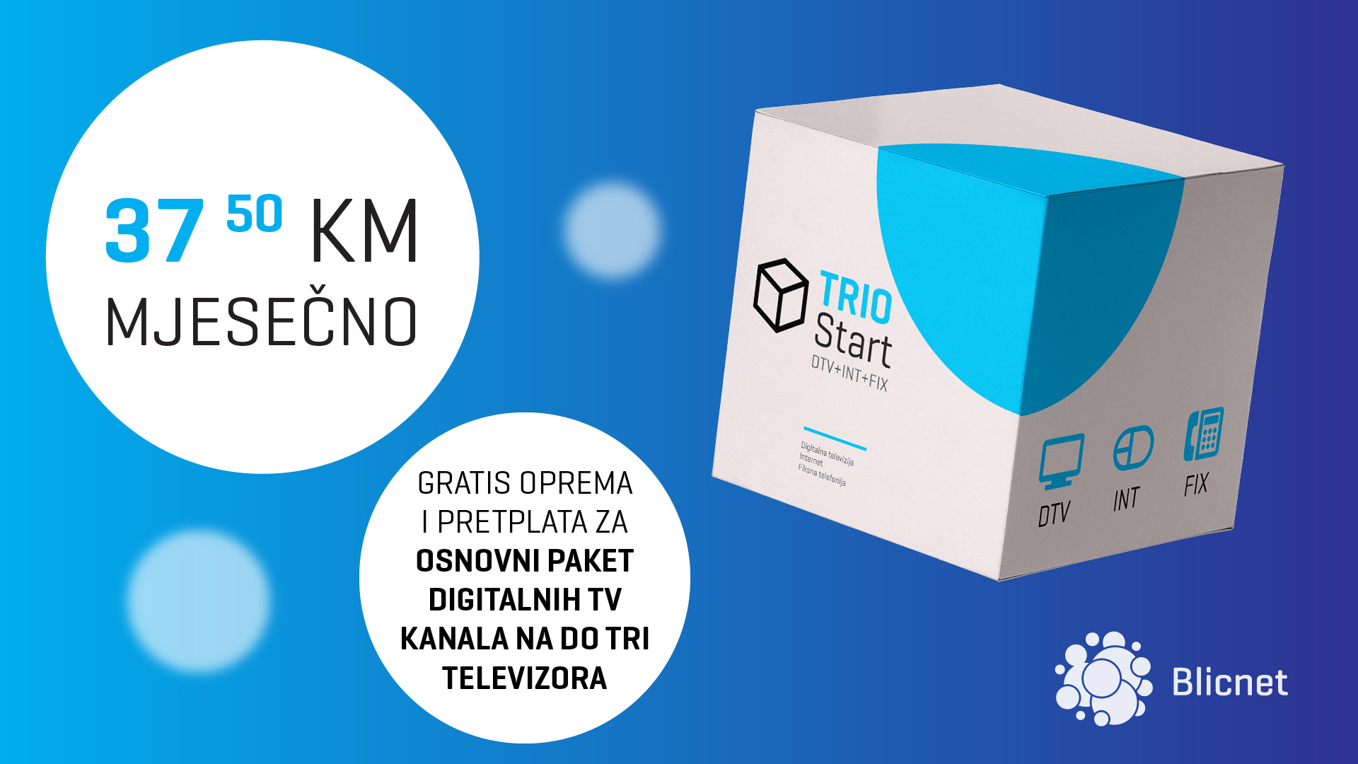 BANJA LUKA, Novi paket predstavlja vrhunski spoj Interneta, fiksne telefonije i digitalne televizije po super cijeni mjesečne pretplate. Izborom TRIO Start paketa uživaćete u digitalnoj televiziji sa velikim i raznovrsnim brojem televizijskih kanala u osnovnom paketu (Digital Standard paket sa preko 100 TV kanala), kao i u brzom Internetu (15/1,5 Mb/s) i fiksnoj telefoniji sa neograničenim razgovorima u Blicnet fiksnoj mreži.