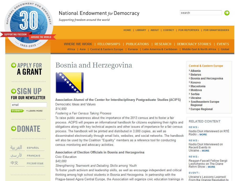 Udruženju izbornih funkcionera u Bosni i Hercegovini NED je dao 40.000$, a Asocijaciji Alumni Centra za interdisciplinarne postdiplomske studije (ACIPS) 14.950 dolara za “podizanje javne svijesti o važnosti popisa 2013. i da podstakne fer proces”.