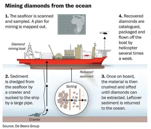 Na morsko dno spuštaju se robotske mašine koje “usisavaju” slojeve sedimenta, nakon čega se materijal transportuje na brod gdje se izdvajaju dijamanti.