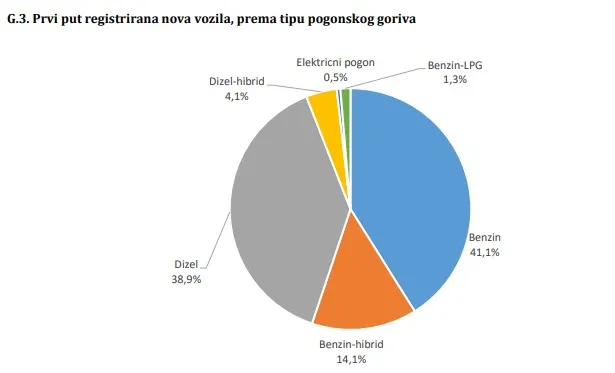 U kategoriji novih putničkih automobila, najveći udio imaju vozila koja kao pogonsko gorivo koriste benzin, sa 42,6 odsto. Samo pola procenta se odnosi na potpuno električna vozila. biznisinfo.ba