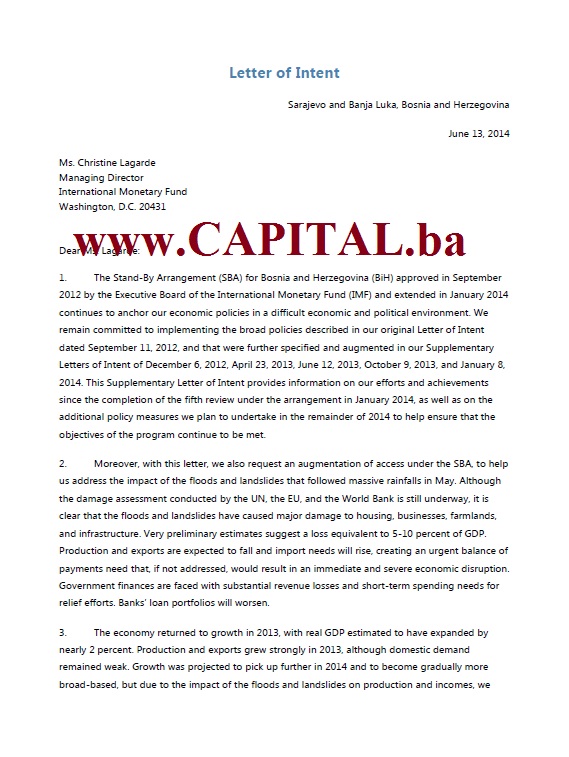 U Pismu od 13. juna, upućeno direktorici MMF-a Kristini Lagard, koje prenosi poslovni portal CAPITAL.ba, entitetske i vlasti na nivou BiH, iznijeli su mnogo težu ocjenu sadašnje situacije i prognoze ekonomskog rasta od one koja je zvanično prisutna u javnosti. (Preuzmi: Pismo namjera MMF)