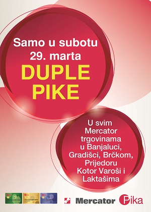 BANJALUKA, Mercator BL obavještava svoje kupce da će ove subote, 29. marta, korisnici Pika kartice biti nagrađeni duplim bodovima za kupovine u svim Mercator trgovinama u Banjaluci, Gradišci, Brčkom, Prijedoru, Kotor Varoši i Laktašima.