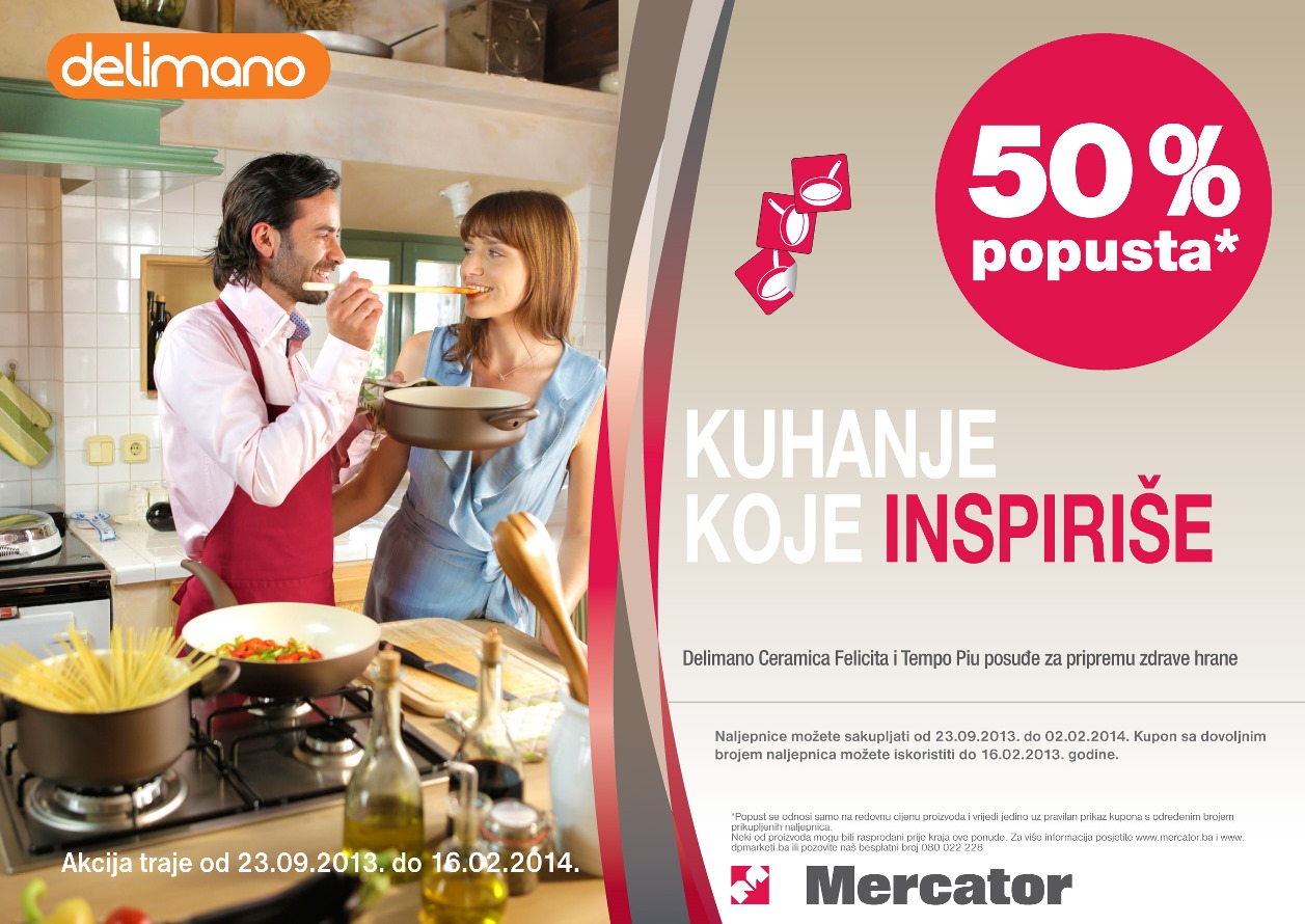 Nakon nekoliko uspješnih projekata lojalnosti, Mercator ponovno organizuje odličnu ponudu za sve svoje kupce koji vode računa o zdravoj ishrani. Ovaj put u Mercatorovoj ponudi se nalazi italijanski brend Delimano Ceramica Felicita sa svojim proizvodima koji su jednostavni za upotrebu i otporni na ogrebotine. U novom projektu lojalnosti Mercatora „Kuhanje koje inspiriše“ nalaze se Delimano tave, šerpe, tepsije i express lonci Tempo Piu od 5,5l i 2,5l za pripremu zdrave hrane. Ove kvalitetne proizvode kupci mogu nabaviti kupovinom u Mercator marketima kada će za svakih potrošenih 10 KM dobiti jednu naljepnicu, a sa sakupljenih 20 naljepnica  ostvariti popust od 50 odsto. Korisnici kartice Mercator Pika do popusta mogu i brže, dovoljno je da sakupe samo 15 naljepnica.