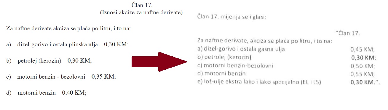U javnosti se do sada nezvanično spominjalo samo moguće povećanju putarine sa 10 na 20 pfeniga, ali sada je vidljivo da će biti povećana i akciza za dodatnih 0,15 KM po litri. Ovo nije konačno poskupljenje, jer posebna akciza i putarina ulaze u osnovicu za obračun PDV-a, tako da će litra goriva u BiH poskupiti znatno više od 25 pfeniga, ukoliko Parlamentarna skupština BiH usvoji neizmjenjen tekst ovih zakona.