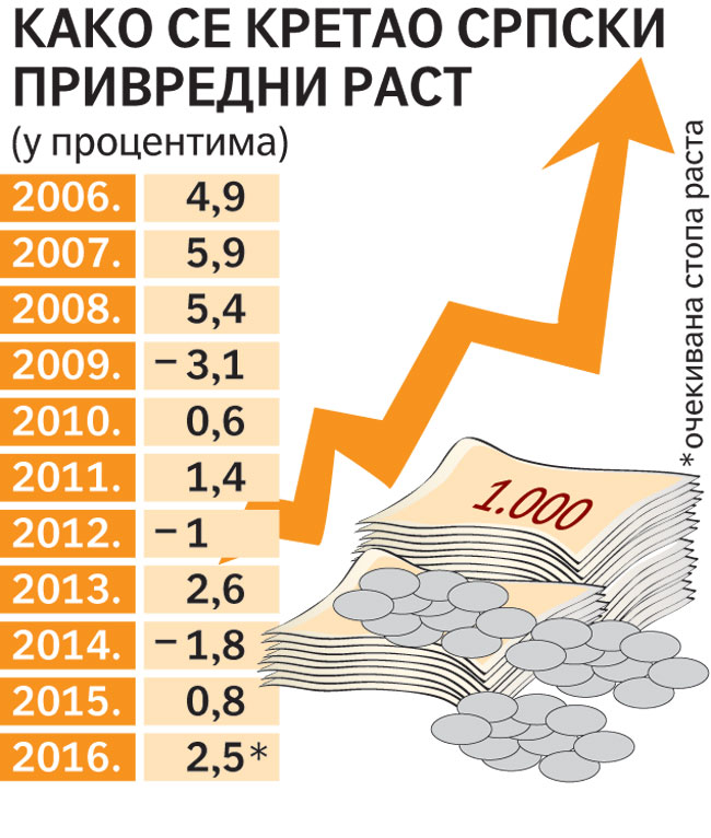 Prvi put – već 2010. godine kada je rast bruto domaćeg proizvoda (BDP), odnosno svega onoga što srpski građani i privreda stvore za godinu dana, iznosio skromnih 0,6 odsto. Međutim, već 2012. privreda je opet skliznula u minus (pad od jedan odsto). U pozitivnu zonu vratila se naredne 2013. godine (plus od 2,6 odsto), ali je taj oporavak bio kratkog daha, pa je na kraju 2014. privredna aktivnost opet bila u minusu od 1,8 odsto.