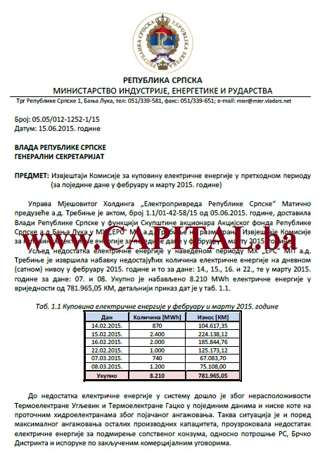 „Usljed nedostatka električne energije u navedenom periodu MH „ERS“ MP a.d. Trebinje je izvršila nabavku nedostajućih količina električne energije na dnevnom (satnom) nivou u februaru 2015. godine i to za dane: 14., 15., 16. i 22., te u martu 2015. godine za dane: 07. i 08. Ukupno je nabavljeno 8.210 MWh električne energije u vrijednosti od 781.965,05 KM“, navodi se Izvještaju Komisije za kupovinu električne energije.