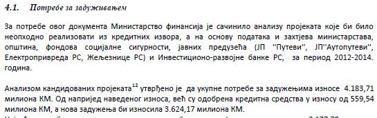 “Za potrebe ovog dokumenta Ministarstvo finansija je sačinilo analizu projekata koje bi bilo  neophodno realizovati iz kreditnih izvora, a na osnovu podataka i zahtjeva ministarstava, opština, fondova socijalne sigurnosti, javnih preduzeća za period 2012.-2014. godina. Analizom kandidovanih projekata utvrđeno je da ukupne potrebe za zaduženjima iznose 4,18 milijardi KM. Od naprijed navedenog iznosa, već su odobrena kreditna sredstva u iznosu od 559,5 miliona KM, a nova zaduženja bi iznosila 3,62 milijarde KM”, navodi se u Politici zaduživanja RS, čiju je izradu, na jednoj od prethodnih sjednica, naručila Narodna skupština RS.