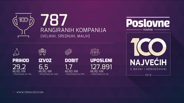 Ukupni prihod koji su ostvarili svi rangirani «100 najvećih u BiH» u 2017. iznosi 29,2 milijarde KM, ili 11% više nego godinu prije. Ove kompanije realizirale su skoro 6,5 milijardi KM izvoza, ili 12% više nego 2016. godine. Ukupna dobit koju su ostvarile iznosi 1,67 milijardi KM, što je porast za 37% u odnosu na godinu ranije.