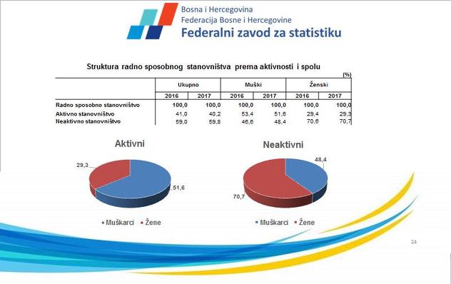 Žene su procentualno manje zaposlene od muškaraca i taj omjer iznosi 29,3 odsto naprema 51,6 odsto u korist muškaraca. klix.ba