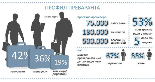 Kroz finansijske malverzacije u preduzećima u Srbiji se godišnje izgubi ogroman novac. Prestup službenika u prosjeku košta 75.000 dolara, menadžera 130.000 dolara, a vlasnika pola miliona dolara.