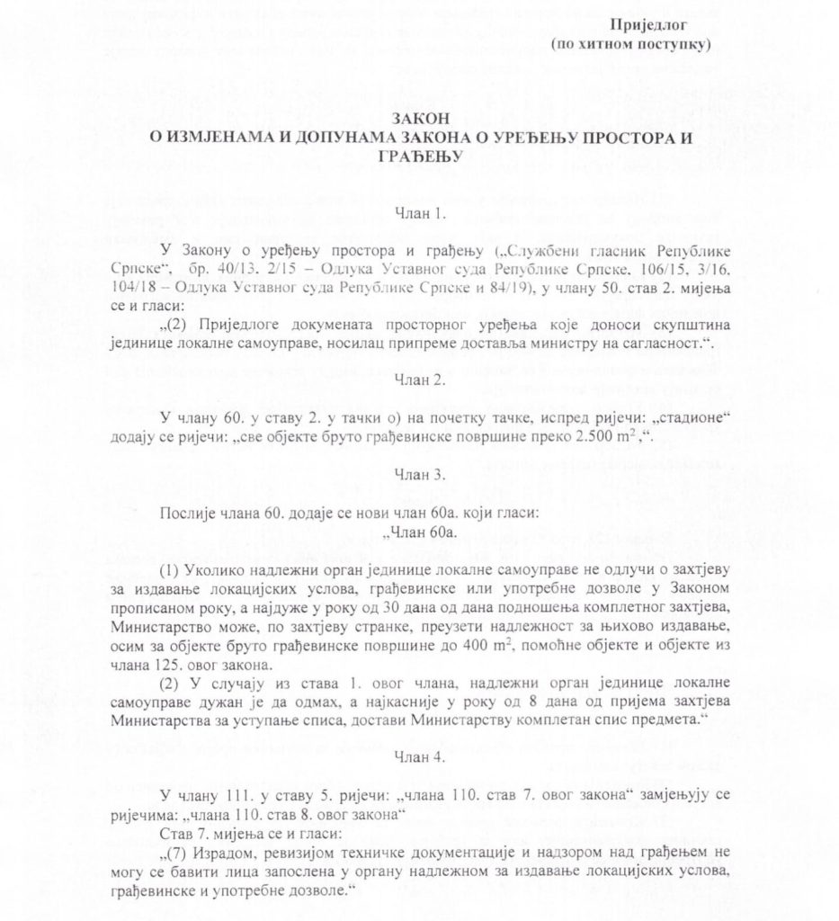BANJALUKA – Predložene izmjene Zakona o uređenju prostora i građenju, koje je Vlada RS uputila u hitnu proceduru, drastično i bez opravdanog razloga centralizuju ključne nadležnosti u oblasti prostornog planiranja i izdavanja građevinskih dozvola, tvrde stručnjaci u ovoj oblasti.