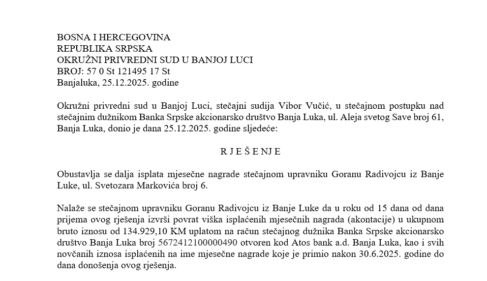 BANJALUKA – Stečajni sudija Okružnog privrednog suda u Banjaluci Vibor Vučić naložio je stečajnom upravniku „Banke Srpske“ Goranu Radivojcu da vrati nepunih 135.000 maraka po osnovu naknade koju je sebi isplatio preko dozvoljenog limita, otkriva portal CAPITAL.