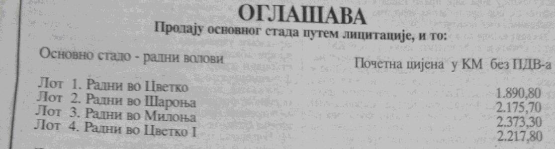 BANJALUKA, Šume Republike Srpske objavile su danas oglas da prodaju četiri vola. U oglasu objavljenom na četvrtine stranice Glasa Srpske, Šume na licitaciji nude radne volove, vlasništvo Šumskog gazdinstva „Sjemeć“ Rogatica. Četiri vola Cvetka, Šaronju, Milonju i Cvetka 1, podijelili su u četiri lota. Vo po lotu.
