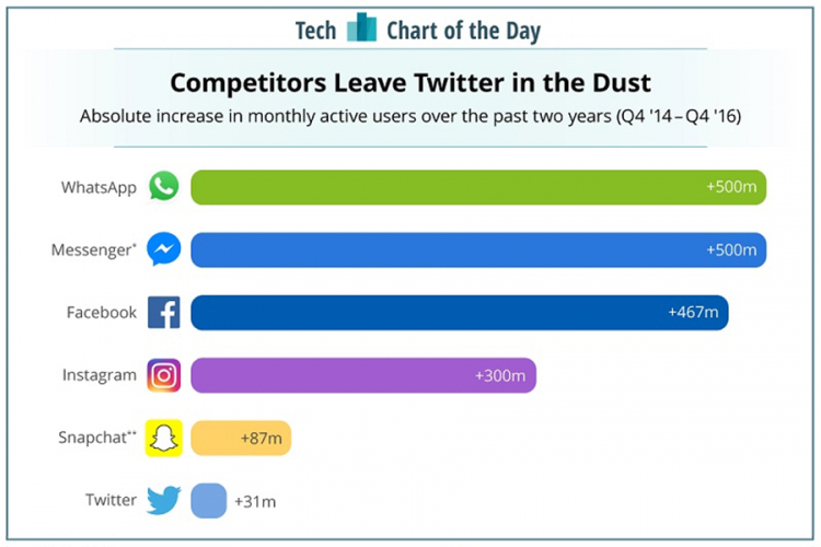 NJUJORK, Kako pokazuju najnovoji podaci, društvena mreža Twitter debelo zaostaje u privlačenju novih korisnika u odnosu na konkurentske mreže.