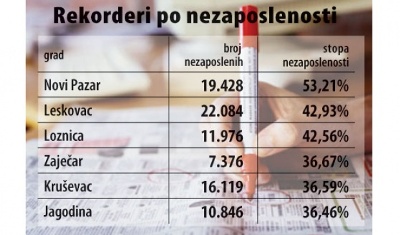 Rekorder po procentu kandidata na evidenciji Nacionalne službe za zapošljavanje, u odnosu na broj stanovnika je Novi Pazar. U ovom gradu ima više onih koji ne rade nego onih koji svakodnevno odlaze na posao. Nešto bolja situacija je u Leskovcu i Loznici, ali su i ovi gradovi, sa oko 42 odsto, daleko ispod republičkog prosjeka od 24 odsto nezaposlenih.